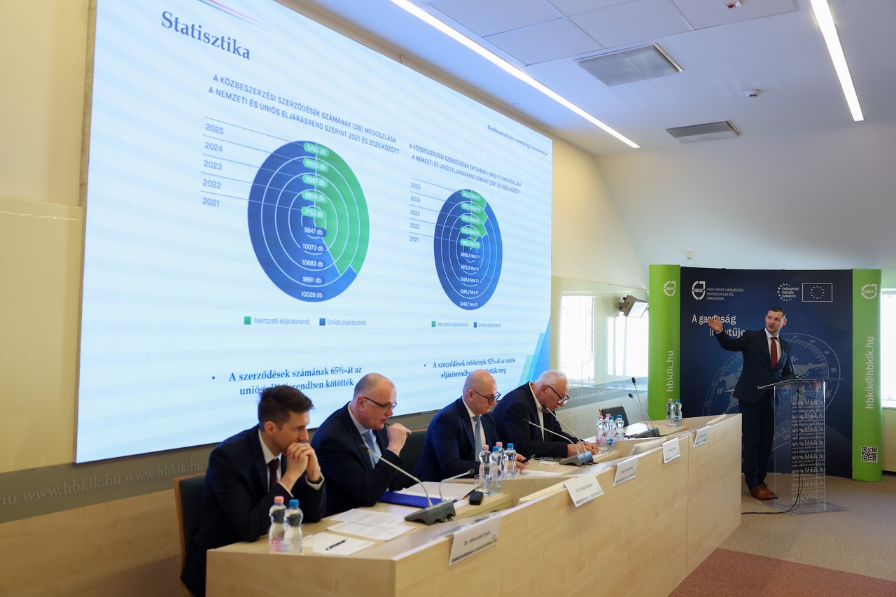 Dr. Kovács László előadásában emellett ismertette a Közbeszerzési Hatóság 2025-re vonatkozó gyorsjelentésének főbb adatait is. A jelentés szerint 2025-ben az ajánlatkérők 6 923 darab eredményes közbeszerzési eljárást folytattak le, összesen 4 278 milliárd forint értékben, amely 15 511 darab szerződés megkötését eredményezte. Az eljárások száma mérséklődött, ugyanakkor az összérték több mint 16 százalékkal emelkedett az előző évhez képest.