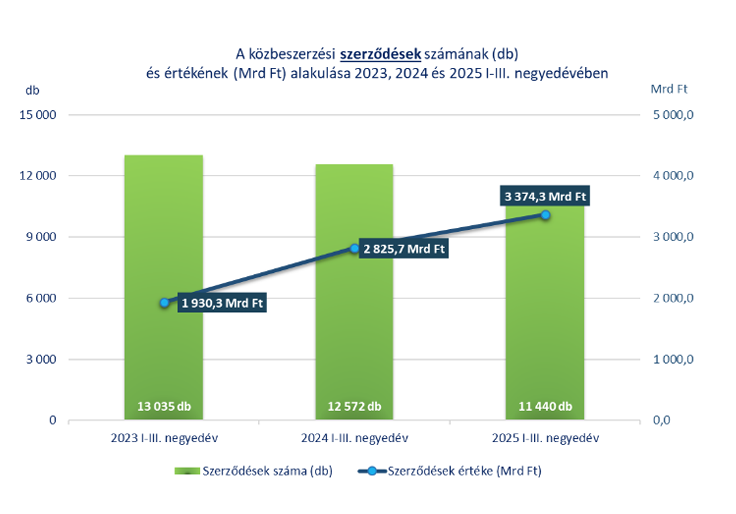 A Közbeszerzési Hatóság legfrissebb gyorsjelentése szerint 2025 első három negyedévében az ajánlatkérők 5107 darab eredményes közbeszerzési eljárást folytattak le, amely összesen 11440 darab közbeszerzési szerződés megkötését eredményezte, 3374,3 milliárd forint összértékben.