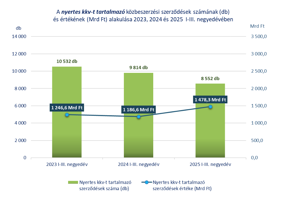 2025 első három negyedévében 8552 darab közbeszerzési szerződés esetében hirdettek ki kis- és középvállalkozást (kkv-t) nyertesként, összesen 1478,3 milliárd forint értékben. Bár a nyertes kkv-t tartalmazó szerződések száma mintegy 13 százalékkal elmaradt az előző év azonos időszakának adatától, az ezekhez kapcsolódó összérték csaknem negyedével emelkedett.